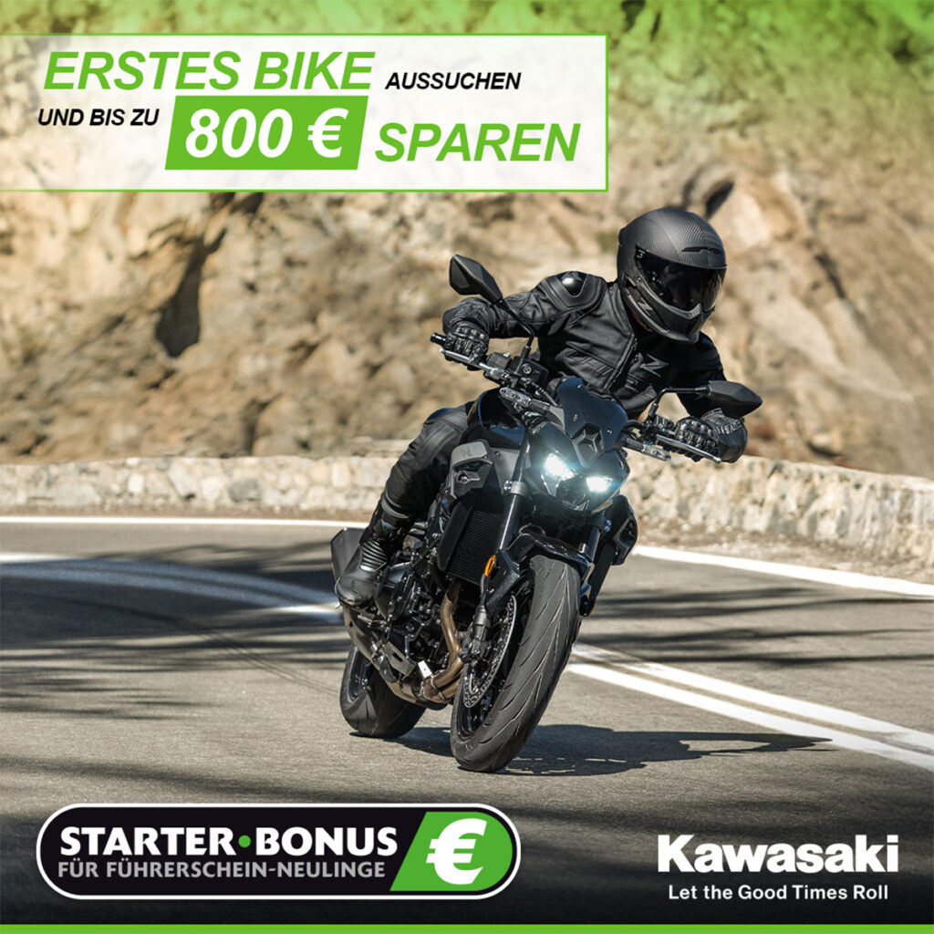 Ganz gleich, für welches Kawasaki-Modell Sie sich entscheiden: Kawasaki macht den Weg zum ersten Bike mit dem STARTER-BONUS leichter! Führerschein-Neulinge erhalten ab 01. Mai 2023 einen Preisnachlass von 1 Euro pro Kubikzentimeter (auf die unverbindliche Preisempfehlung zzgl. Fracht und Nebenkosten) für alle neuen Kawasaki-Motorräder (ausgenommen sind die Ninja H2R sowie die 50th-Anniversary-Sondermodelle). Übrigens: Die Käufer einer neuen Ninja 125 oder Z125 bekommen einen besonderen STARTER-BONUS bei Kawasaki. Für beide Modelle beträgt der Zuschuss ganze 500 Euro!.