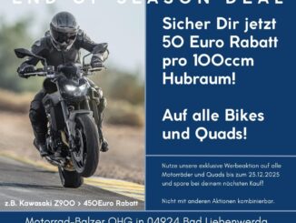 Wir starten in die kalte Jahreszeit mit unserem END OF SEASON DEAL! Ab sofort erhältst du beim Kauf eines Neufahrzeugs pro 100 ccm Hubraum 50 EUR Rabatt. Dieses Angebot gilt für alle Neufahrzeuge und Neufahrzeugbestellungen, [...]